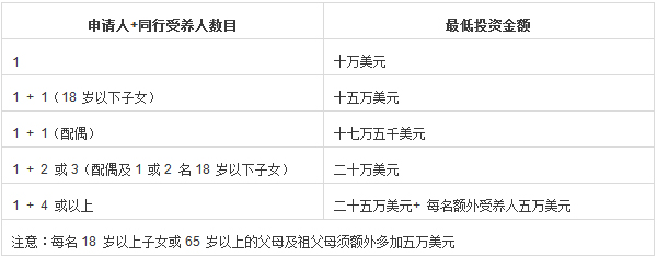 注:1、除了以上投資金額外,主申請(qǐng)人還須支付七千五百美元作為背景審查的費(fèi)用。如同行的受養(yǎng)人年滿12 歲,亦須支付有關(guān)費(fèi)用。配偶的背景審查費(fèi)用與主申請(qǐng)人相同,12 至16 歲受養(yǎng)人的背景審查費(fèi)用為二千美元,16 至25 歲或65 歲以上受養(yǎng)人的背景審查費(fèi)用為四千美元。