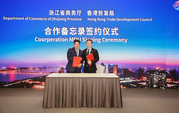 浙江省商務(wù)廳盛秋平廳長(zhǎng)與香港貿(mào)發(fā)局中國(guó)內(nèi)地總代表簽署合作備忘錄