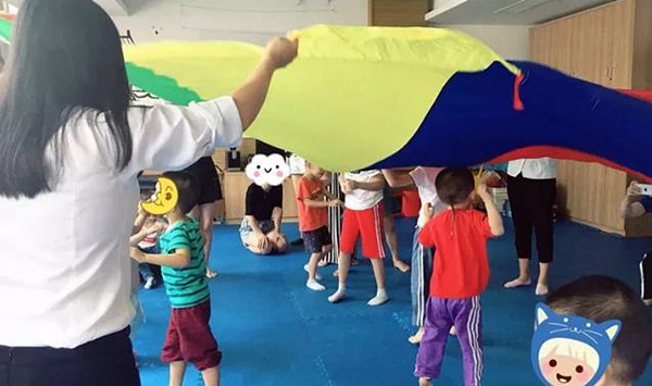 帶著孩子們玩彩虹傘抓小魚(yú)的游戲,孩子們的笑臉是對(duì)我們最好的回報(bào)