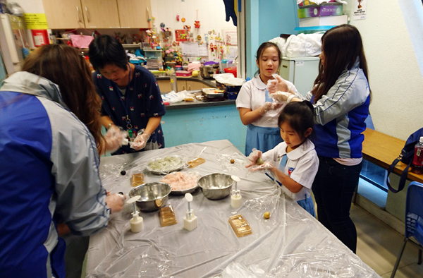 另一邊大家都留心聽導師的教導,瑞豐義工團協(xié)助小朋友制作冰皮月餅,其樂融融。