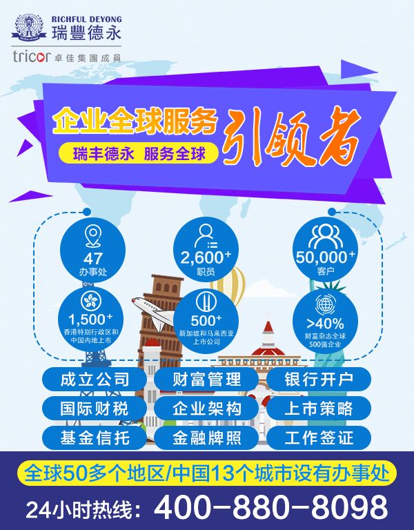 瑞豐德永(Richful Deyong)2008年始創(chuàng)于香港,系卓佳(Tricor)集團(tuán)成員,是亞洲具有領(lǐng)先地位的專業(yè)服務(wù)機構(gòu),在全球21個國家/地區(qū)47個城市設(shè)有辦事處,擁有2500多名員工,服務(wù)超過30000客戶,1300間香港聯(lián)交所上市公司,500間新加坡和馬來西亞上市公司,名列財富雜志500強企業(yè)超40%及眾多跨國知名公司。