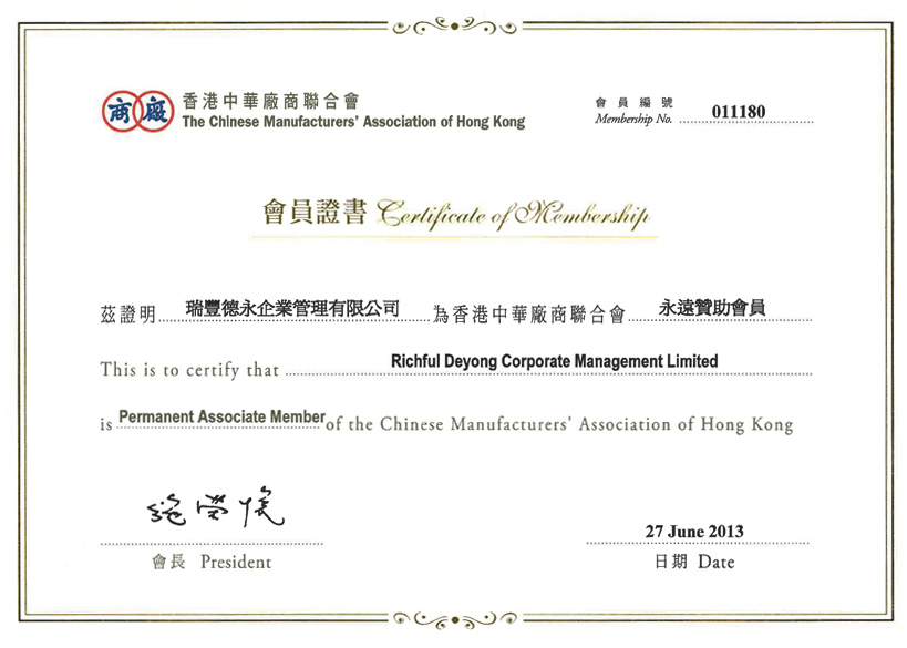 香港中華廠商聯(lián)合會(huì)頒發(fā)會(huì)員證書(shū)