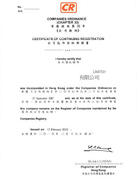 香港公司的“公司注冊證書”--由香港公司注冊處頒發(fā),長期有效(除非撤銷),類似于國內(nèi)的營業(yè)執(zhí)照性質(zhì),有唯一的公司編號;