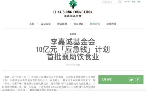 同一天,李嘉誠(chéng)基金會(huì)發(fā)布聲明:香港現(xiàn)正面對(duì)前所未有的挑戰(zhàn),為解飽受打擊的中小企燃眉之急,基金會(huì)此前宣布捐款10億元“應(yīng)急錢”。