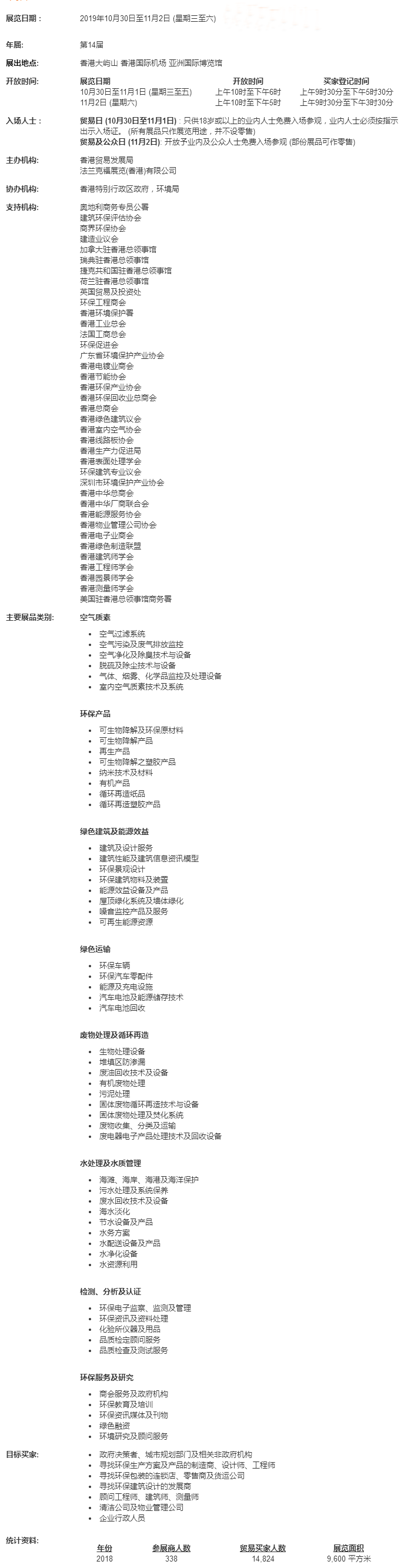 國際環(huán)保博覽是亞洲環(huán)保行業(yè)的優(yōu)質(zhì)商貿(mào)平臺,展示最新的環(huán)保產(chǎn)品、設(shè)備和先進技術(shù)。博覽由香港特區(qū)政府環(huán)境局協(xié)辦,通過香港、中國內(nèi)地及國際政府部門和行業(yè)商會的鼎力支持,為環(huán)保行業(yè)提供企業(yè)對政府(B2G)和企業(yè)對企業(yè)(B2B)層面的商機。