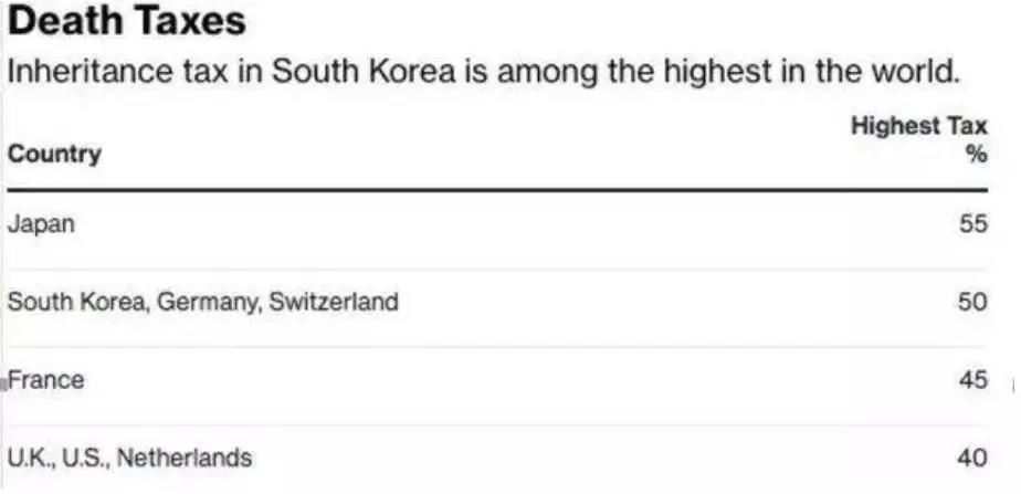 根據(jù)安永會計(jì)師事務(wù)所出具的報(bào)告,韓國的遺產(chǎn)稅排在世界前列,最高繳納稅率要高于法國的45%,英國、美國的40%,與德國、瑞士持平。