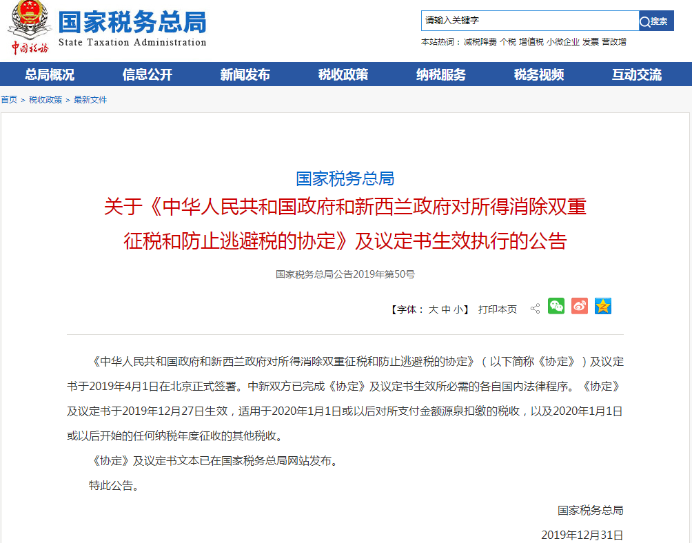 一、中國新西蘭稅收協(xié)定已生效
