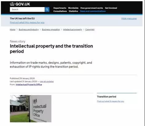 英國知識產(chǎn)權(quán)局于 2020 年 1 月 29 日發(fā)布并于 31 日更新了知識產(chǎn)權(quán)與過渡期通知。
