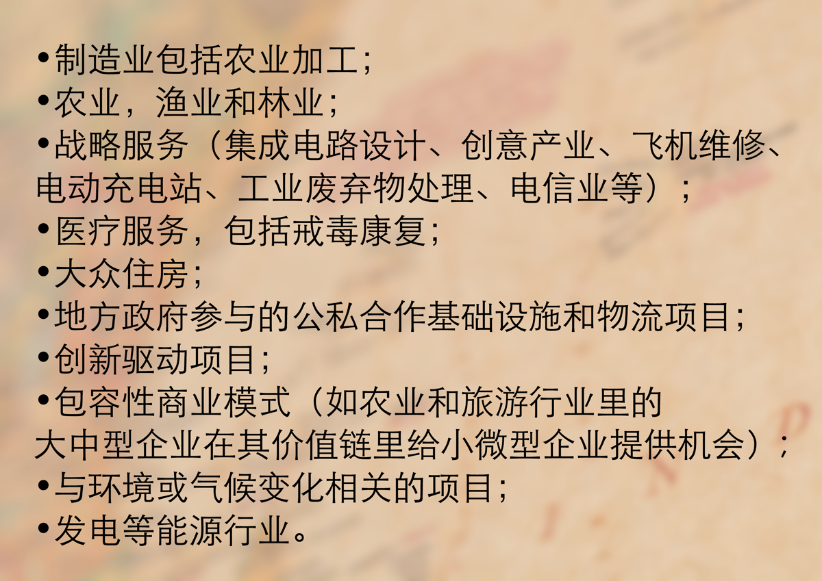 2017年頒布了投資優(yōu)先計劃,其主題是“擴大和分散機會”,計劃中被視為“首選”投資領域有: