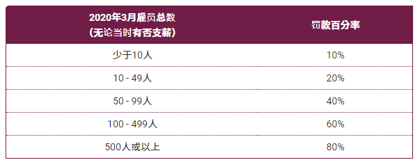 罰款百分率是按雇主于2020年3月的雇員總數(shù)多少(無(wú)論當(dāng)時(shí)有否支薪)訂定,即雇員人數(shù)愈多,罰款百分率愈高: