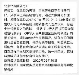 近日,多家經營京東、淘寶/天貓網店的店主向媒體表示,在5月收到了當地稅務局部門的“風險自查提示”,對他們存在的少記營業(yè)收入風險進行提示,并要求自查從2017年至2019年存在的漏報問題并補繳稅款以及滯納金。