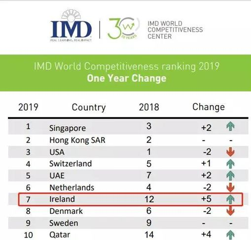 長期以來,愛爾蘭一直被視為通往歐洲市場及其5億人口的門戶,經(jīng)濟方面,在瑞士洛桑國際管理發(fā)展學(xué)院(IMD business school)發(fā)布《2019年世界競爭力報告》排名中,愛爾蘭躍升至第七位,在歐盟成員里面排名第二!