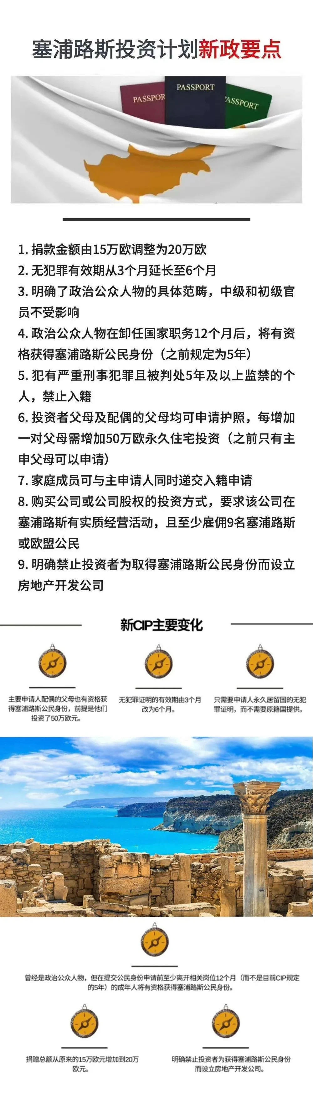 塞浦路斯在此背景下也采取了從每年推出700個(gè)限制配額、到增加捐款、到嚴(yán)格審核資料等等收縮改進(jìn)措施,今年塞浦路斯“公民投資計(jì)劃”將面臨調(diào)整,目前得知的相關(guān)新政細(xì)節(jié)如下↓↓