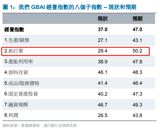 “企業(yè)認(rèn)為第三季度經(jīng)營狀況將顯著改善,且國內(nèi)訂單預(yù)期比出口訂單更好?!毕愀圪Q(mào)發(fā)局研究總監(jiān)關(guān)家明表示,第三季度新訂單預(yù)期大幅改善,從二季度的29.4上升至50.2,超過中性值,說明國內(nèi)外市場復(fù)蘇情況樂觀,在全部8個(gè)預(yù)期子指數(shù)中,「新訂單」子指數(shù)相比「現(xiàn)狀」的上升幅度最大。