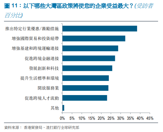 接下來的兩個(gè)選擇是「鞏固國際貿(mào)易和投資關(guān)系」與「增強(qiáng)基礎(chǔ)設(shè)施和跨境交通運(yùn)輸連通性」,表明港澳、與珠三角之間生產(chǎn)要素中必不可少的金融服務(wù)、與跨境連通性的重要意義。