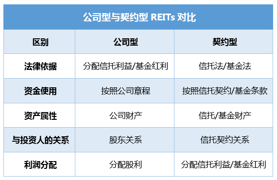 根據(jù)組織形式的不同,REITs可以分為公司型和契約型兩類。具體采用哪一種形式取決于當(dāng)?shù)貙?duì)于 REITs法律載體的規(guī)定,不同的載體由不同的法律法規(guī)約束,受不同的監(jiān)管機(jī)構(gòu)監(jiān)管,具有不同的行為和運(yùn)作模式。