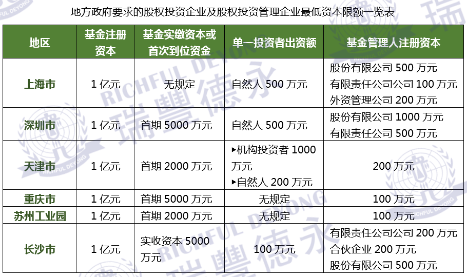 各地對股權(quán)投資企業(yè)注冊門檻限制體現(xiàn)在注冊資本或?qū)嵗U資本方面。北京市是其中的例外,對股權(quán)投資企業(yè)沒有最低資本要求。