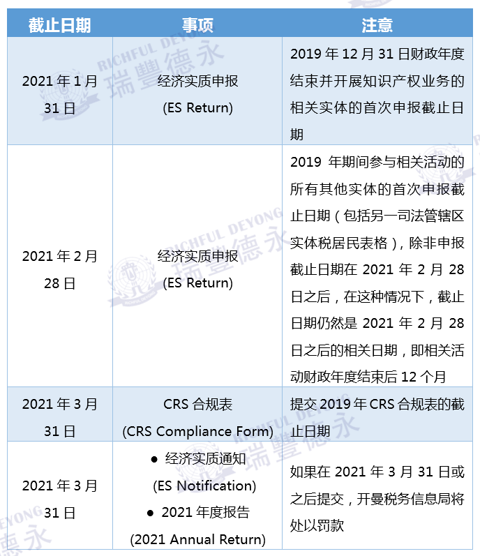 而經(jīng)濟(jì)實(shí)質(zhì)申報(bào)(ES Return)的截止日期為相關(guān)活動(dòng)財(cái)政年度結(jié)束后12個(gè)月內(nèi)。