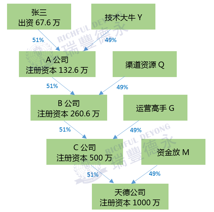通過如上金字塔結(jié)構(gòu),我們可以發(fā)現(xiàn)實(shí)際控制人張三通過4級(jí)控制層、1個(gè)控制鏈條,以區(qū)區(qū)67.6萬的出資額,即控制了天德公司1000萬資金的使用和實(shí)體公司運(yùn)營。
