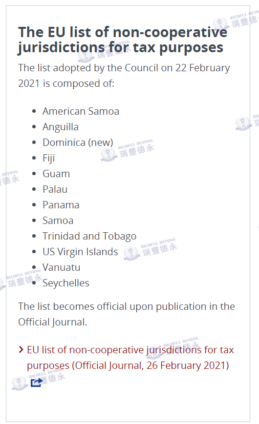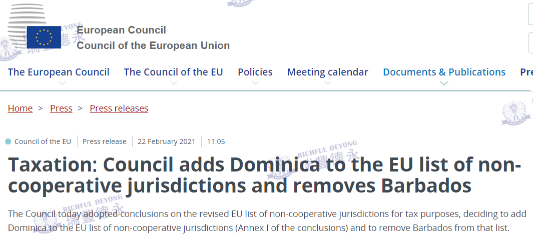 2021年2月22日,歐盟理事會在其官網(wǎng)上發(fā)布一則公告:就經(jīng)修訂的「出于稅收目的的歐盟非合作管轄區(qū)清單」(俗稱“黑名單”)通過了結(jié)論,歐盟決定將多米尼加(Dominica)加入該名單中,同時將巴巴多斯(Barbados)移出“黑名單”。