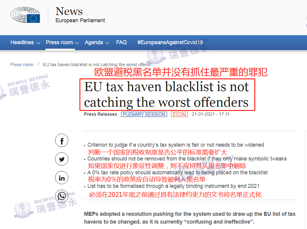 ?? 值得一提的是,在2021年1月21日,歐洲議會通過了一項(xiàng)決議,要求理事會和歐洲委員會改革歐盟稅收黑名單,并要求更新清單標(biāo)準(zhǔn)和采取更加協(xié)調(diào)一致的防御措施(更多細(xì)節(jié))。