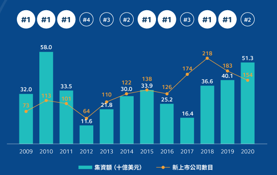 2020年盡管環(huán)球市場波動異常,但是港交所的一級市場仍領先全球IPO集資榜,共有154家公司在香港交易所上市,2020年首次公開招股集資額位列全球第二,集資金額達3,975億港元,是2010年以來最高。