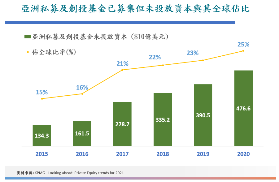 近期行業(yè)研究報告統(tǒng)計顯示,亞洲私募及創(chuàng)投基金已募集但未投放的資本(行業(yè)內(nèi)稱為Dry Powder)創(chuàng)下4,700億美元新高,占全球25%。以資產(chǎn)管理規(guī)模計算,香港目前已經(jīng)是亞洲區(qū)內(nèi)第二大私募基金市場(管理1,730億美元),僅次于內(nèi)地。