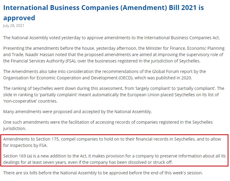 2021年8月,塞舌爾當局出臺了《2021 年國際商業(yè)公司(修訂)法》。
