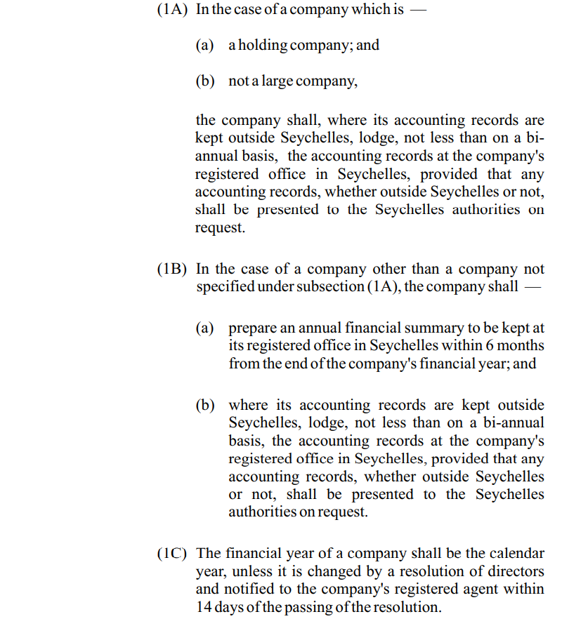 所有在登記冊上的公司皆必須每半年提交并備存其會計記錄在其塞舌爾的注冊辦事處內(nèi)。