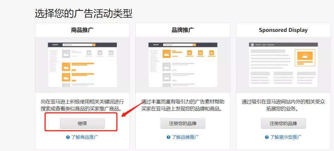 第三步:在新建廣告活動(dòng)頁面,選擇商品推廣方式底下的【繼續(xù)】,進(jìn)入新建廣告活動(dòng)頁面。