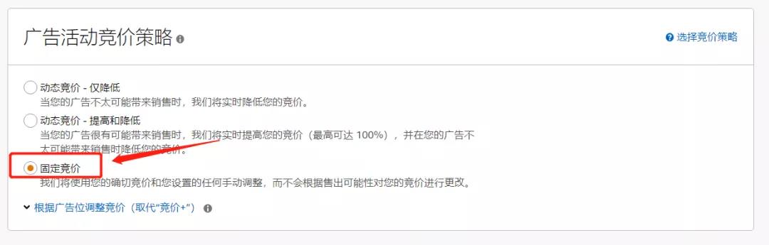 第五步:在【廣告活動(dòng)競價(jià)策略】中,按照自己的商品投放要求進(jìn)行設(shè)置競價(jià)方式,新品的話建議是【固定競價(jià)】。