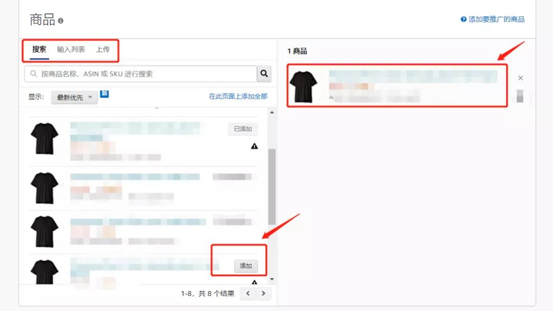 ①搜索:直接在搜索框中輸入商品名稱、ASIN、SKU,搜索出需要投放的商品,點(diǎn)擊商品右邊的【添加】即可。