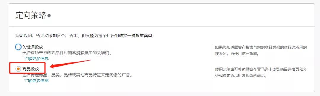 第八步:在選擇好要投放商品后,在【定向策略】中,選擇【商品投放】。