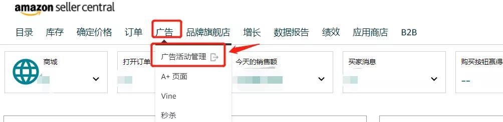第一步:打開亞馬遜賣家后臺(tái),找到工具欄中的【廣告】——【廣告活動(dòng)管理】。