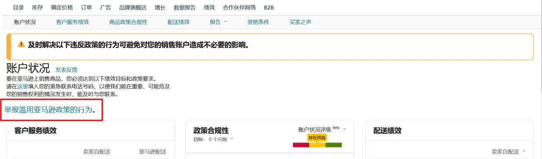 您可以通過賣家平臺,打開“賬戶狀況”,點擊“舉報濫用亞馬遜政策的行為”進行舉報。