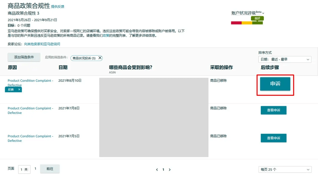 通過“商品政策合規(guī)性”頁面,您可以看到違反亞馬遜政策的商品記錄。您可以對該頁面中顯示的違規(guī)問題進行申訴。