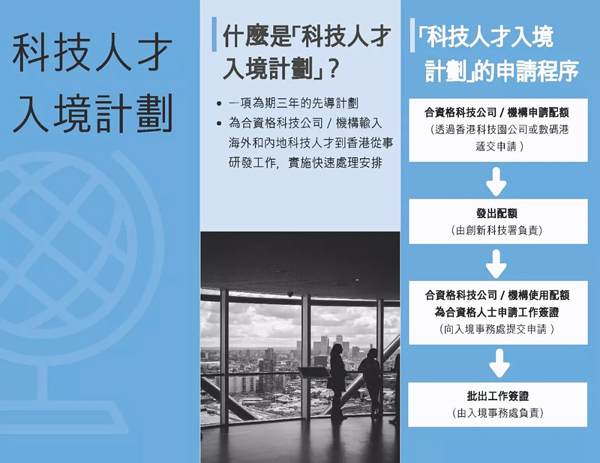 “科技人才入境計(jì)劃”(下稱“計(jì)劃”)是一項(xiàng)為期三年的先導(dǎo)計(jì)劃,旨在通過快速處理安排,為符合資格的科技公司(機(jī)構(gòu))輸入海外和內(nèi)地科技人才來港從事研發(fā)工作 。首個運(yùn)作年度引入最多1000名科技人才。