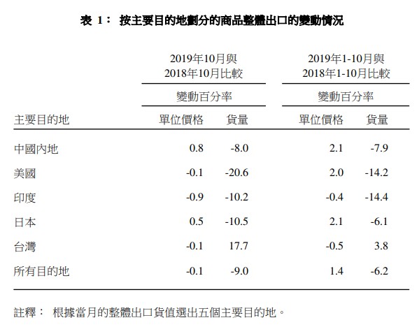2019年10月與2018年10月比較,輸往美國(-20.6%)、日本(-10.5%)及印度(-10.2%)的整體出口貨量錄得雙位數(shù)字跌幅。同時,輸往中國內(nèi)地(內(nèi)地)的整體出口貨量亦下跌8.0%。另一方面,輸往臺灣的整體出口貨量則上升17.7%。與此同時,輸往印度(-0.9%)、美國(-0.1%)及臺灣(-0.1%)的整體出口價格下跌。另一方面,輸往日本(0.5%)及內(nèi)地(0.8%)的整體出口價格則上升。