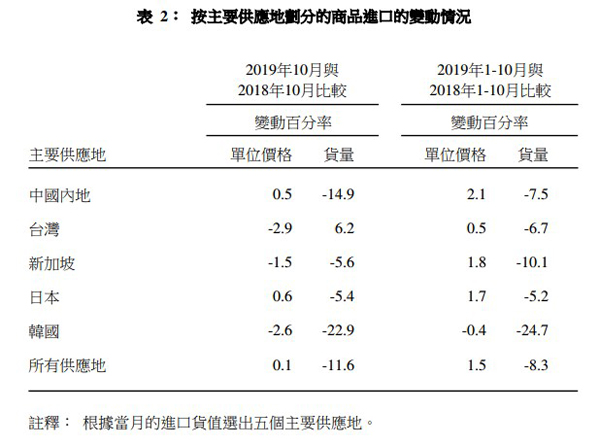 2019年10月與2018年10月比較,來自韓國(-22.9%)及內(nèi)地(-14.9%)的進口貨量錄得雙位數(shù)字跌幅。同時,來自新加坡(-5.6%)及日本(-5.4%)的進口貨量亦下跌。另一方面,來自臺灣的進口貨量則上升6.2%。