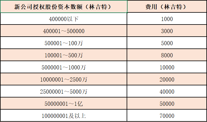 公司設(shè)立的費用將根據(jù)新公司擬授權(quán)的不同股份資本數(shù)量按照下述表格而收取固定費用: