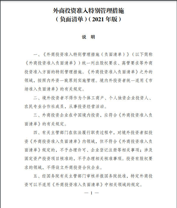 貫徹落實(shí)黨中央、國務(wù)院決策部署,推動(dòng)實(shí)施更大范圍、更寬領(lǐng)域、更深層次對(duì)外開放,以高水平開放促進(jìn)高質(zhì)量發(fā)展,國家發(fā)改委會(huì)同商務(wù)部等部門修訂發(fā)布了2021年版外資準(zhǔn)入負(fù)面清單。