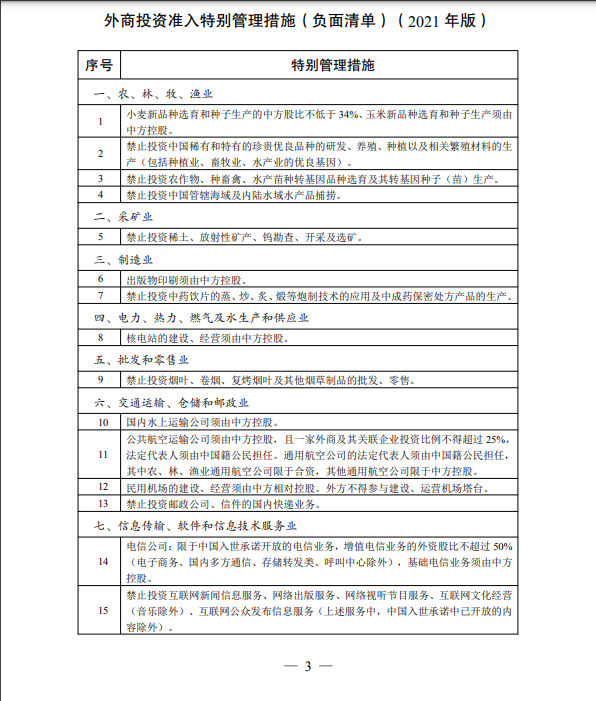 12月27日,國家發(fā)展改革委、商務(wù)部發(fā)布了《外商投資準(zhǔn)入特別管理措施(負(fù)面清單)(2021年版)》和《自由貿(mào)易試驗(yàn)區(qū)外商投資準(zhǔn)入特別管理措施(負(fù)面清單)(2021年版)》。