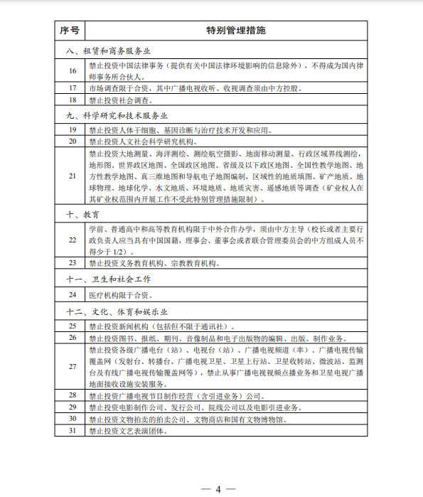 第三,提高外資準(zhǔn)入負(fù)面清單精準(zhǔn)度。在負(fù)面清單說明部分增加“從事外資準(zhǔn)入負(fù)面清單禁止投資領(lǐng)域業(yè)務(wù)的境內(nèi)企業(yè)到境外發(fā)行股份并上市交易的,應(yīng)當(dāng)經(jīng)國家有關(guān)主管部門審核同意,境外投資者不得參與企業(yè)經(jīng)營管理,其持股比例參照境外投資者境內(nèi)證券投資管理有關(guān)規(guī)定執(zhí)行”,由證監(jiān)會(huì)和有關(guān)主管部門按規(guī)定對(duì)從事負(fù)面清單禁止領(lǐng)域業(yè)務(wù)的境內(nèi)企業(yè)到境外上市融資實(shí)行精準(zhǔn)化管理。