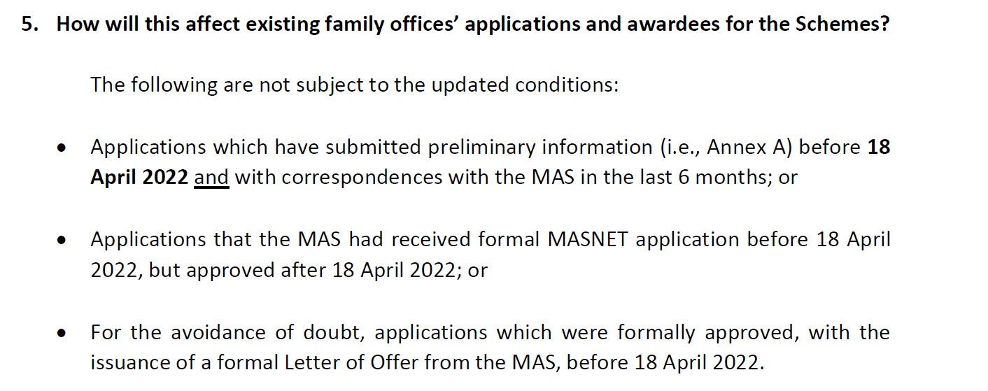 這兩天也陸續(xù)收到已辦理完成的老客戶(hù)問(wèn)詢(xún)新政策是否會(huì)對(duì)他們的家族辦公室有影響,以下是新加坡金融管理局的官方回答: