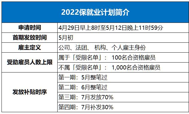香港啟動(dòng)“2022保就業(yè)”計(jì)劃,并于4月29日至5月12日接受申請,為期兩周,預(yù)計(jì)首批資助在5月初開始發(fā)放。計(jì)劃總財(cái)政承擔(dān)約430億港元,將惠及約160萬名雇員及約14萬名自雇人士。
