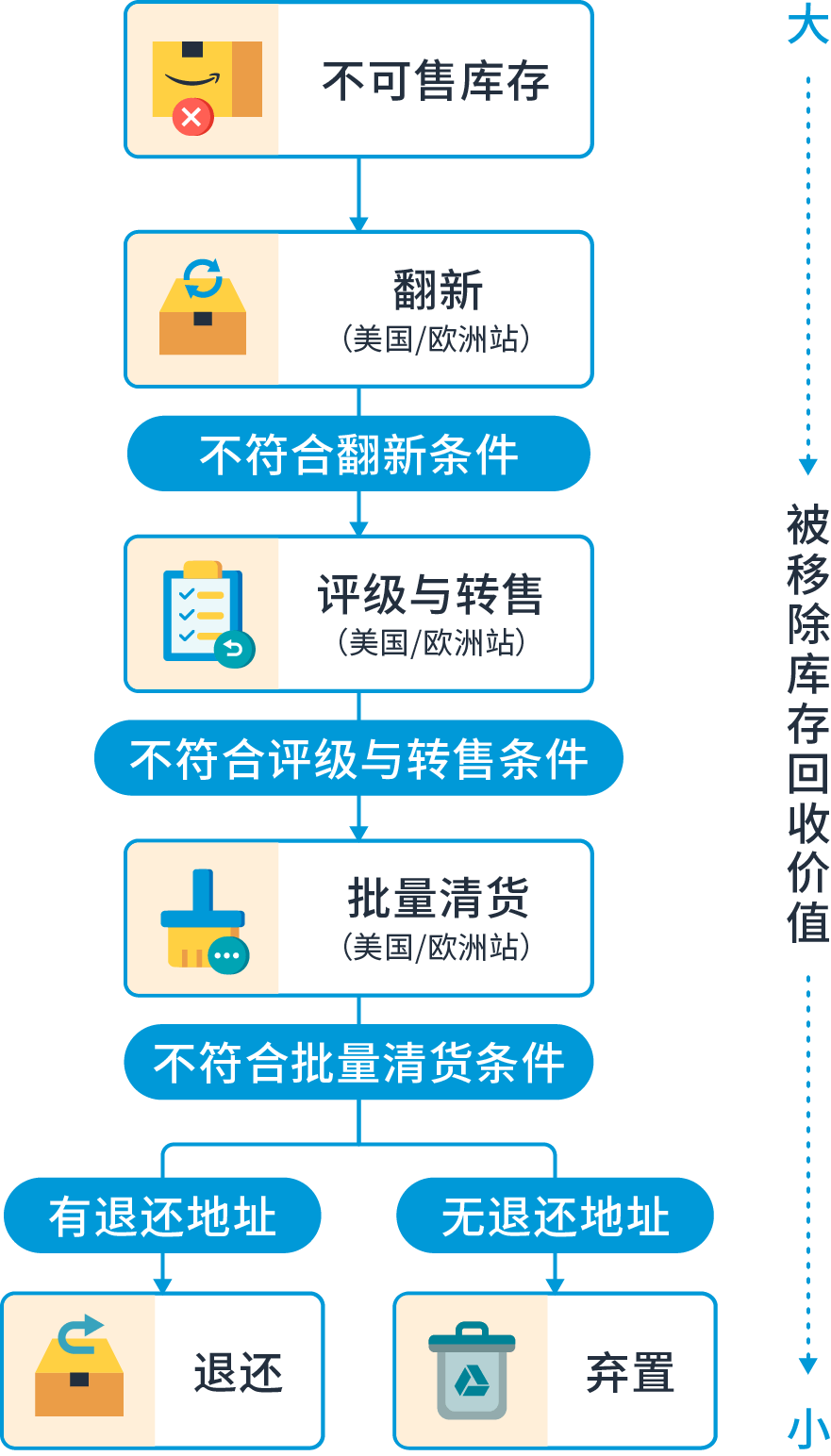 不可售商品的自動(dòng)移除是指在亞馬遜運(yùn)營(yíng)中心的不可售庫(kù)存無(wú)須手動(dòng)設(shè)置,將會(huì)被自動(dòng)設(shè)定為“自動(dòng)移除”,亞馬遜為這些不可售庫(kù)存增加了價(jià)值回收選項(xiàng)。