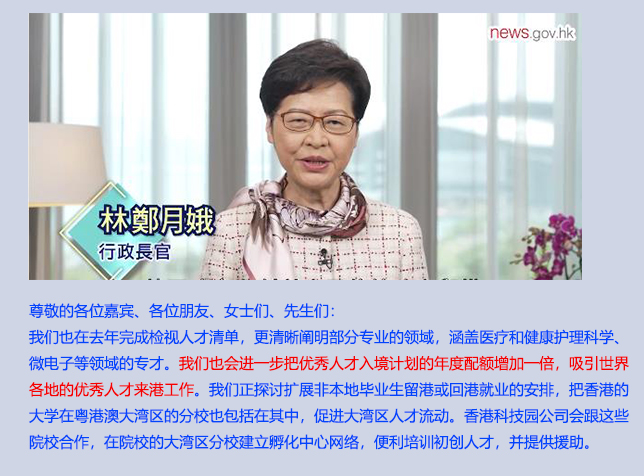 在第20屆中國國際人才交流大會上,前行政長官林鄭月娥表示,本屆政府銳意配合國家十四五規(guī)劃,把香港建設(shè)成為國際創(chuàng)新科技中心。在吸引人才上,優(yōu)秀人才入境計(jì)劃年度配額將倍增,當(dāng)局并正探討擴(kuò)展非本地畢業(yè)生留港或回港就業(yè)的安排。