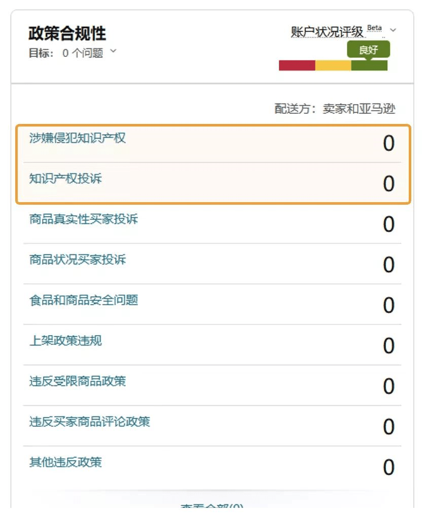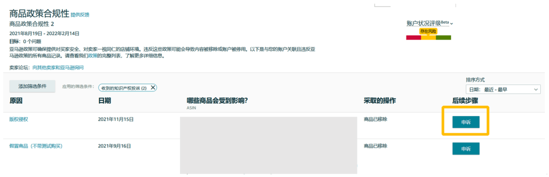 通過“商品政策合規(guī)性”頁面,您可以看到違反亞馬遜政策的商品記錄。當(dāng)您看到“涉嫌侵犯知識產(chǎn)權(quán)” 、 “知識產(chǎn)權(quán)投訴” 兩欄內(nèi)容有警示,則意味著可能存在侵權(quán)問題。接下來您可以對該頁面中顯示的違規(guī)問題進(jìn)行申訴。