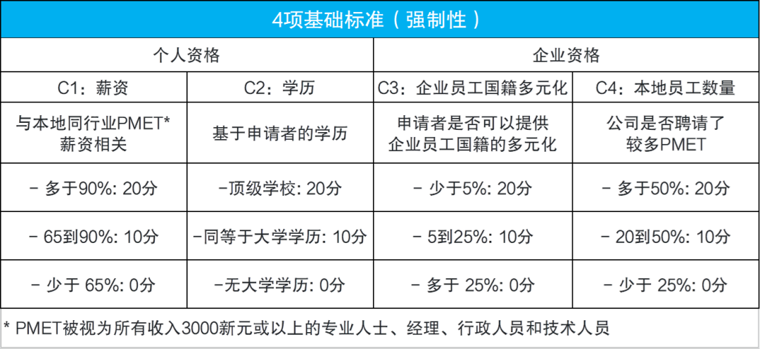每個項目最高得分20分,總分達到40分才可申請/聘請EP。