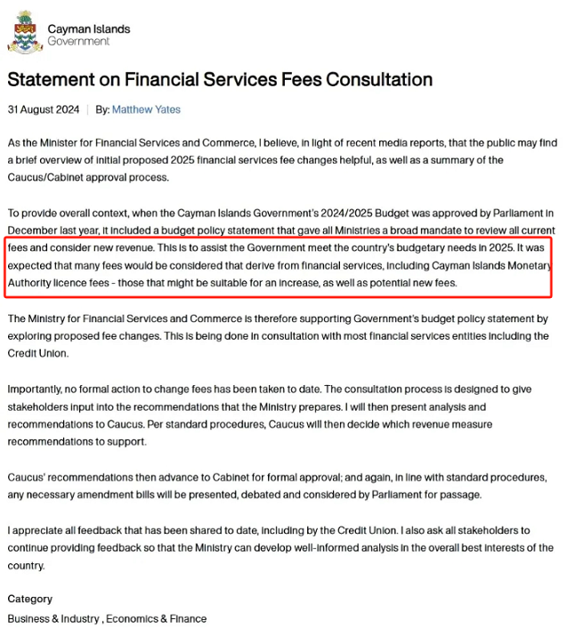 開曼群島政府近日發(fā)布咨詢文件,建議于2025年1月1日起調(diào)高所有開曼群島公司的政府牌照費(fèi)用。關(guān)于費(fèi)用調(diào)整的原因,開曼群島金融服務(wù)部的解釋中提到:“為了幫助政府滿足2025年的預(yù)算需求,將通過探索擬議費(fèi)用變更來支持政府的預(yù)算政策聲明,許多來自金融服務(wù)的費(fèi)用將被考慮,包括開曼群島金融管理局的許可費(fèi),可能適當(dāng)增加的費(fèi)用,以及潛在的新費(fèi)用。因此,將對(duì)開曼群島公司年費(fèi)費(fèi)用進(jìn)行調(diào)整,以彌補(bǔ)增加的服務(wù)交付成本?!?